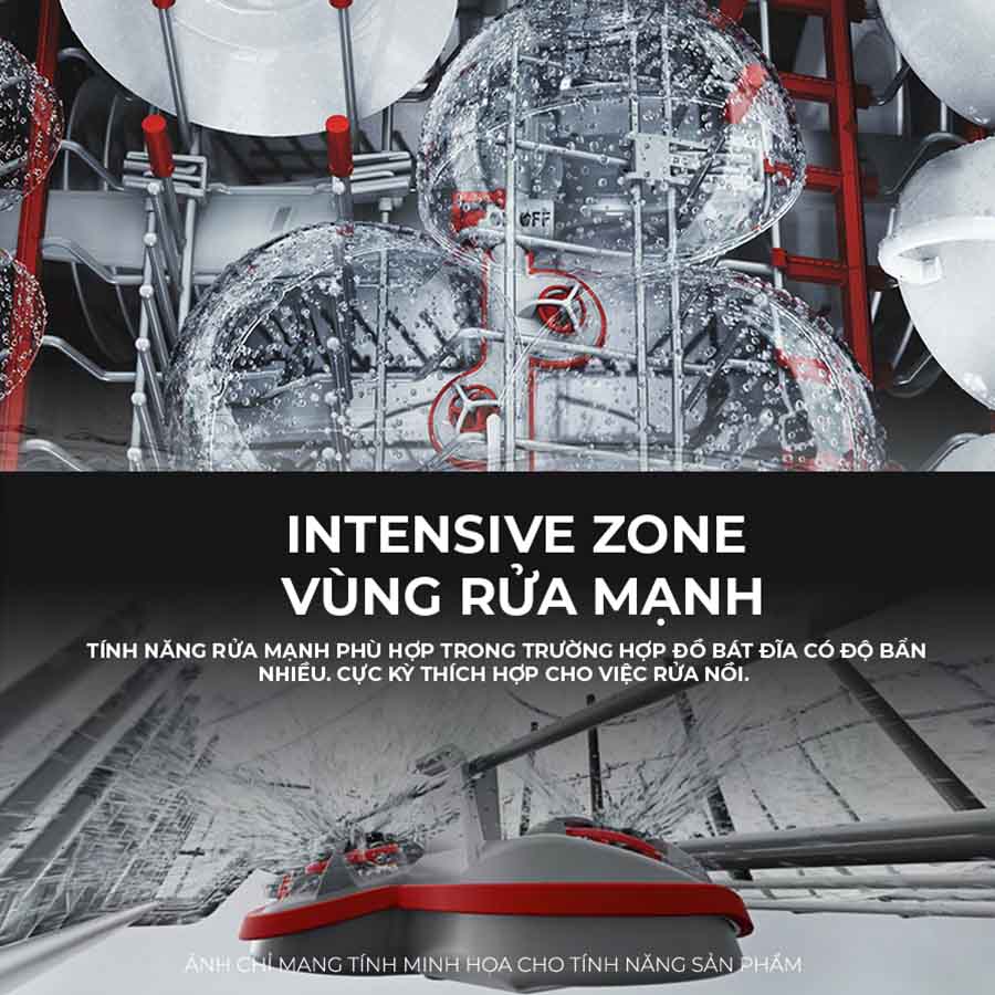 Áp lực nước mạnh và nhiệt độ cao tập trung vào vùng rửa chuyên sâu Intensive Zone ở giàn dưới. Mọi vết bẩn bám dính cứng đầu trên xoong chảo sẽ được loại bỏ sạch sẽ, trong khi bát đĩa hay ly cốc ở ngăn trên vẫn được rửa nhẹ nhàng.