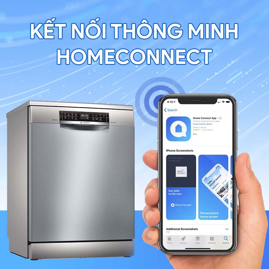 Người dùng có thể kết nối và điều khiển hoạt động máy ngay trên thiết bị di động thông qua ứng dụng Home Connect. Các hoạt động của máy rửa bát sẽ được cập nhật thông báo liên tục lên thiết bị di động. Bạn có thể dễ dàng cài đặt chương trình rửa, điều khiển từ xa được hầu hết các chức năng máy và kiểm soát điện năng tiêu thụ của thiết bị dễ dàng. Bên cạnh đó, ứng dụng còn có thể đề xuất chương trình rửa sấy phù hợp với chén bát hiện tại trong khoang, giúp bạn thao tác nhanh chóng và đảm bảo hiệu quả làm sạch tốt hơn.