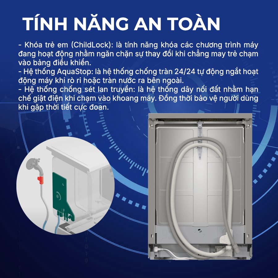 Khi kích hoạt tính năng này, bảng điều khiển sẽ bị vô hiệu hóa, không thể nhấn nút chọn chức năng hay khởi động chương trình rửa. Từ đó, tránh trường hợp trẻ nghịch ngợm nhấn nút làm gián đoạn hoạt động của máy. Đồng thời đảm bảo an toàn cho bé.