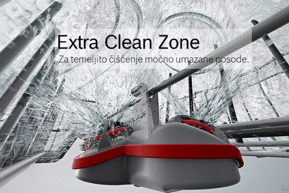 ExtraClean Zone là khu vực đặc biệt trên giỏ trên của máy, nơi trang bị ba vòi phun mạnh mẽ xoay tròn để xử lý vết bẩn cứng đầu như ngũ cốc khô, bã cứng, nước sốt khô,… Mà không cần thêm chất tẩy hay tăng nhiệt độ nước. Khu vực này có thể bật/tắt linh hoạt bằng một nút gạt, mang lại sự chủ động và tiết kiệm hóa chất rửa trong quá trình sử dụng.