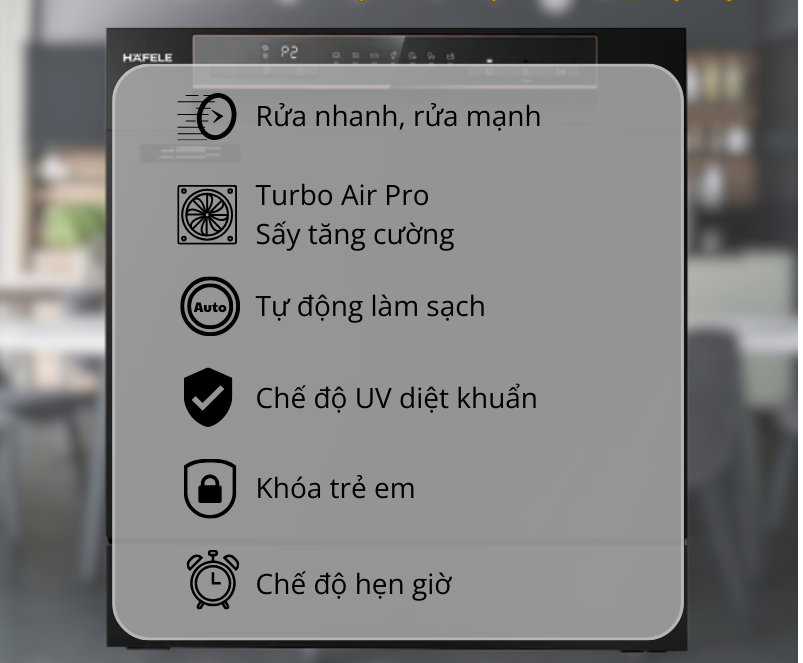 Tính năng nổi bật của máy rửa bát Hafele là chế độ sấy khô tăng cường Turbo Air Pro, kết hợp với công nghệ đèn UV diệt khuẩn. Hệ thống này không chỉ giúp khô đồ nhanh chóng mà còn giữ cho chúng luôn sạch sẽ, an toàn với hiệu quả tiêu diệt vi khuẩn kéo dài trong 72 giờ. Điều này rất hữu ích trong việc duy trì môi trường ăn uống sạch sẽ và lành mạnh cho gia đình.