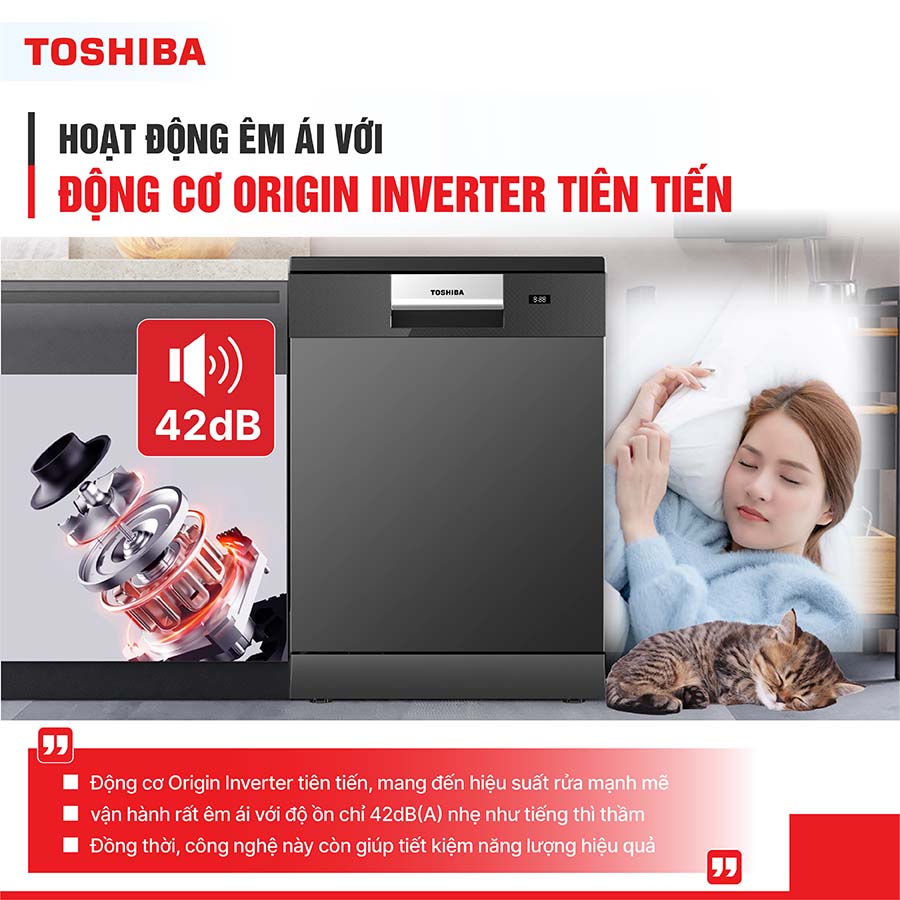 Trái tim của máy rửa bát Toshiba DW-15F7(G)-VN chính là động cơ Origin Inverter thế hệ mới công nghệ tiên tiến được Toshiba phát triển nhằm tối ưu hiệu suất rửa, đồng thời mang đến sự vận hành bền bỉ, tiết kiệm và êm ái vượt trội.