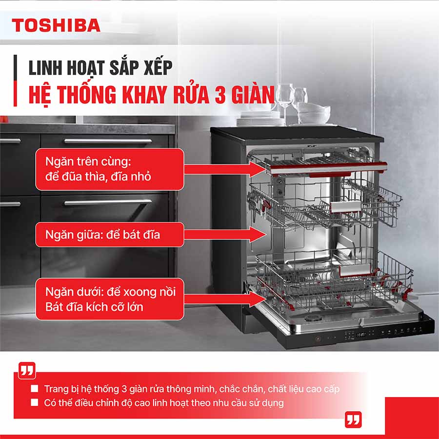 Khác với các dòng máy rửa bát thiết kế theo tiêu chuẩn châu Âu vốn tối ưu cho đĩa phẳng, ly và dao nĩa, hệ thống 3 giàn trên Toshiba được điều chỉnh để phù hợp với bát sâu, tô lớn, đũa, muỗng, nồi niêu những vật dụng quen thuộc trong bữa cơm người Việt. Giàn thứ 3 ở trên cùng là nơi lý tưởng để sắp xếp các vật dụng nhỏ như đũa, thìa, dao kéo, giúp giải phóng không gian cho hai giàn còn lại.