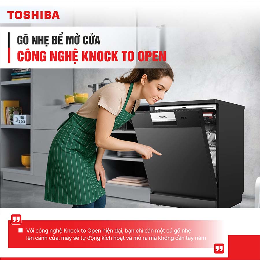 Một trong những điểm nhấn thiết kế hiện đại trên máy rửa bát Toshiba DW-15F7(G)-VN chính là công nghệ Knock to Open tính năng mở cửa thông minh chỉ với một cú gõ nhẹ vào cánh máy. Đây là giải pháp hoàn hảo cho các không gian bếp tối giản, sang trọng, nơi tay nắm truyền thống được loại bỏ để đảm bảo tính thẩm mỹ liền mạch.