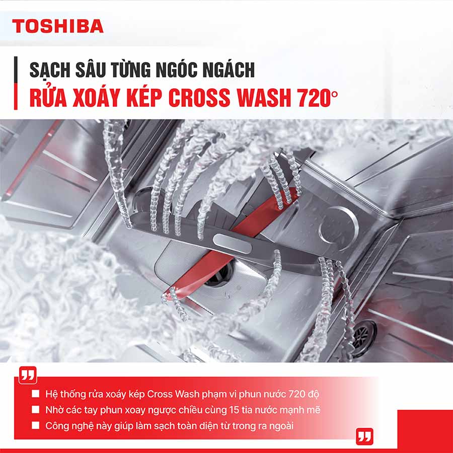 Máy rửa bát Toshiba DW-15F7(G)-VN được trang bị hệ thống rửa xoáy kép Cross Wash công nghệ làm sạch tiên tiến, giúp nâng cao hiệu quả xử lý bát đĩa với số lượng lớn mà vẫn đảm bảo sạch sâu, nhanh chóng và tiết kiệm.