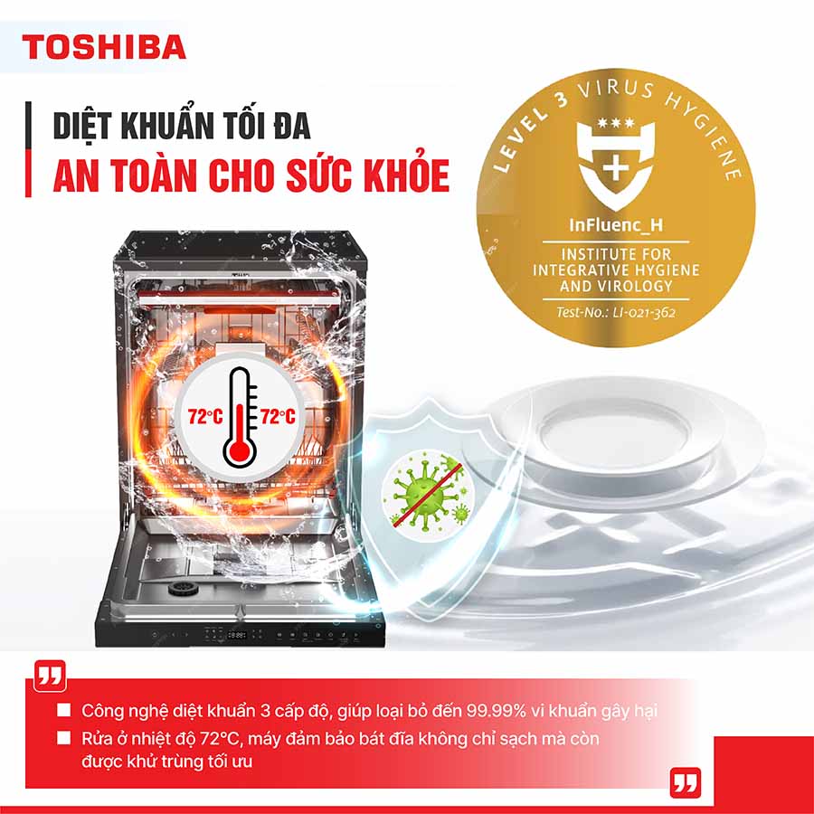 Đặc biệt, khả năng diệt khuẩn của Toshiba DW-15F7(G)-VN đã được kiểm nghiệm và chứng nhận bởi viện vệ sinh và virus học tại Đức một trong những tổ chức uy tín hàng đầu châu Âu. Đây là minh chứng rõ ràng cho cam kết chất lượng của sản phẩm, bảo vệ sức khỏe người dùng ở mức cao nhất.