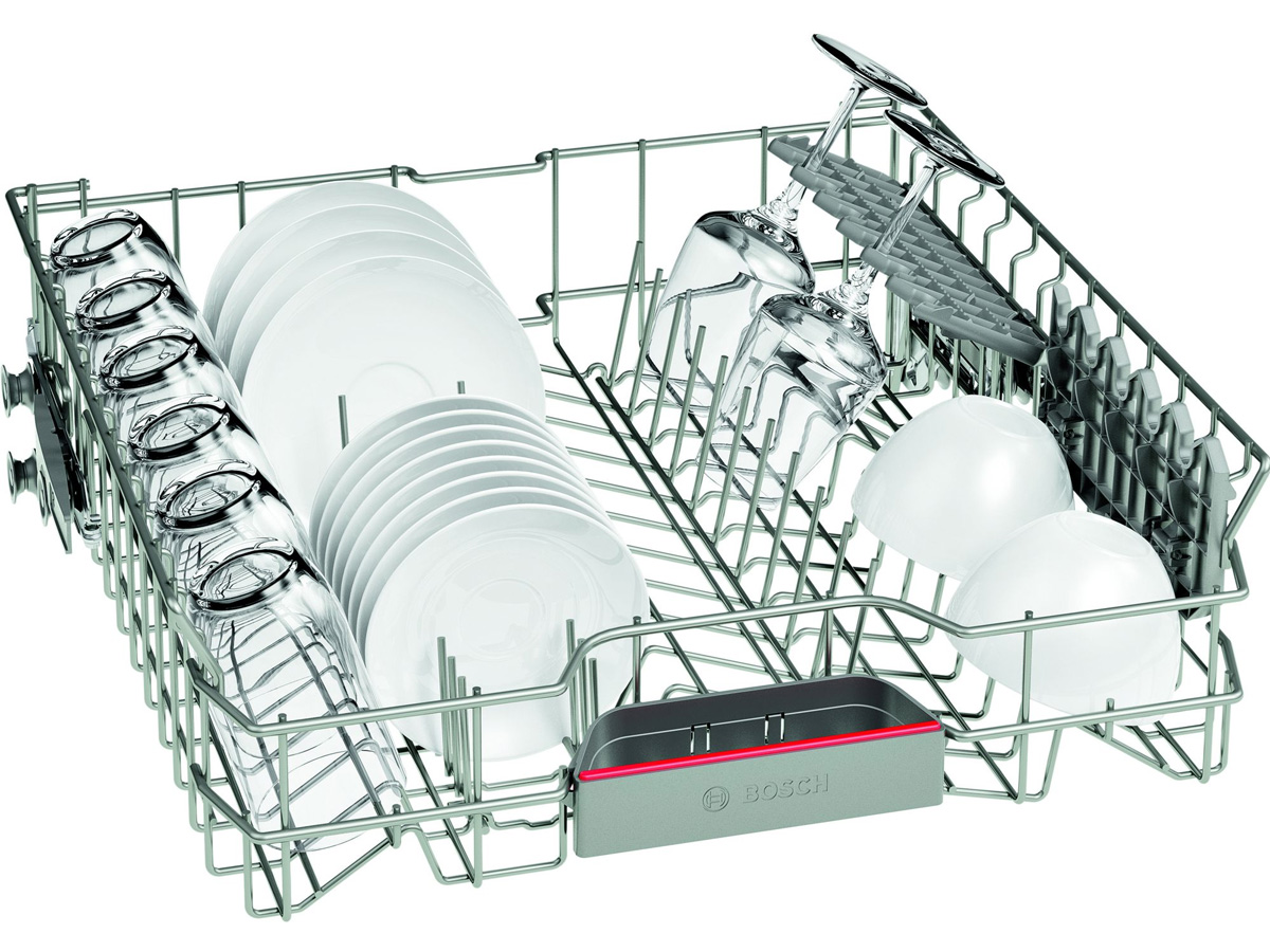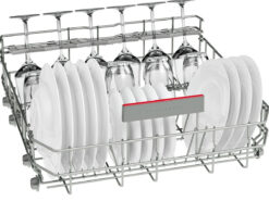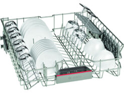 Bosch SMS46MI07E thiết kế lắp đặt độc lập, hướng mở cửa xuống dưới. Bên trong có 3 giàn (giàn xếp dao kéo riêng). Kích thước máy là 84,5 x 60 x 60 cm.