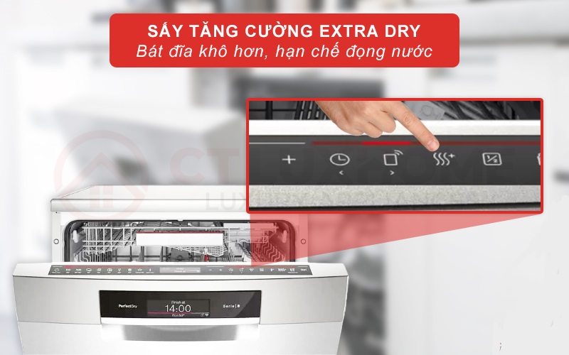Sấy tăng cường Extra Dry cho bát đĩa khô hơn, hạn chế đọng nước