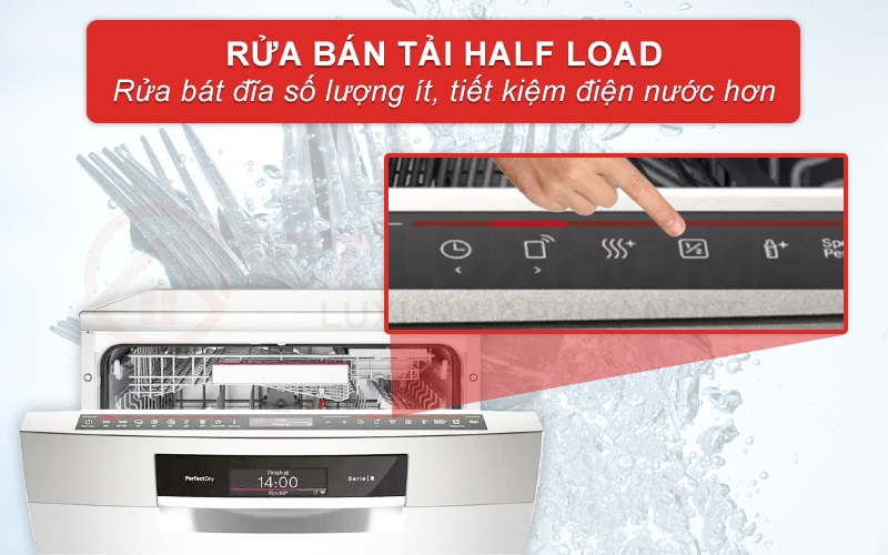 Lưu ý, khi chọn chế độ rửa bán tải Half Load, người dùng chỉ nên cho lượng chất tẩy rửa bằng một nửa so với khi rửa full tải, để tiết kiệm chất tẩy mà bát đĩa cũng không bị nhờn.