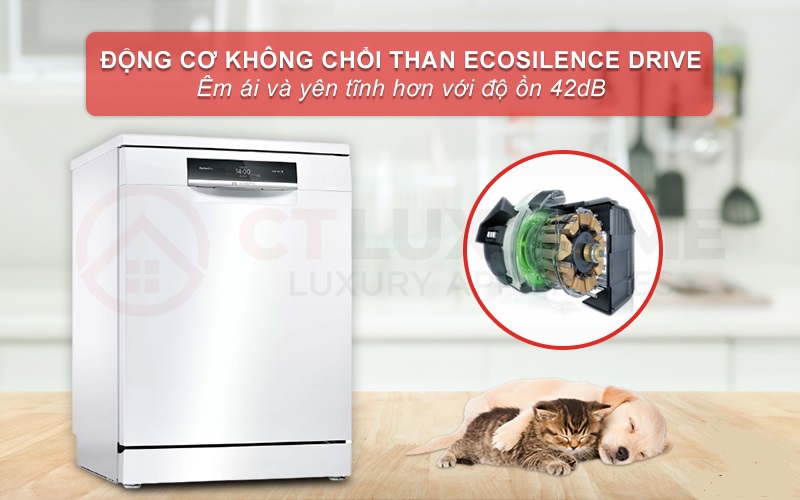Máy rửa bát SMS8ZDW48M serie 8 của Bosch được trang bị động cơ EcoSilence Drive nhằm đảm bảo máy hoạt động mạnh mẽ công suất cao nhưng động cơ vẫn hoạt động êm ái đảm bảo không ảnh hưởng đến người dùng