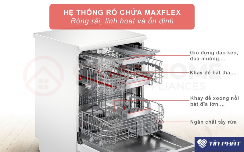 Hệ thống rổ MaxFlex 3 giàn rửa rộng rãi cùng giỏ chứa bát đĩa dưới cùng