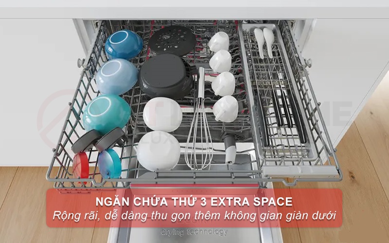 Hơn thế nữa giàn 3 ExtraSpace được thiết kế đặc biệt giúp cho người dùng có thể rửa được cả bát nhỏ, chén nước chấm hoặc tách cà phê.