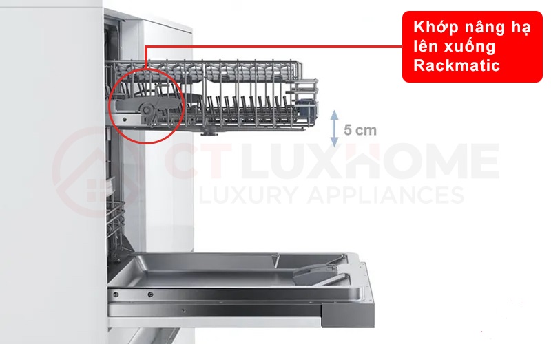 Hệ thống Rackmatic giúp giàn rửa trở nên linh hoạt hơn. Khấc điều chỉnh chiều cao giàn giữa lên đến 5cm người dùng có thể linh động rửa các vật dụng có kích thước lớn