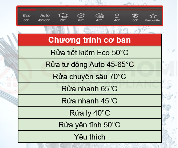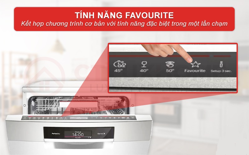 Khi ở chế độ mặc định chương trình Favourite được mặc định là chế độ rửa tráng 15 phút. Người dùng có thể cài đặt chương trình yêu thích bằng cách kết hợp 1 chương trình cơ bản và tính năng đặc biệt