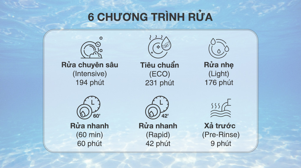 – Máy rửa chén này được tích cài đặt sẵn 6 chương trình rửa khác nhau tùy theo nhu cầu của người dùng, bao gồm: rửa chuyên sâu, rửa tiêu chuẩn, rửa nhẹ, rửa 60 phút, rửa nhanh, xả trước.