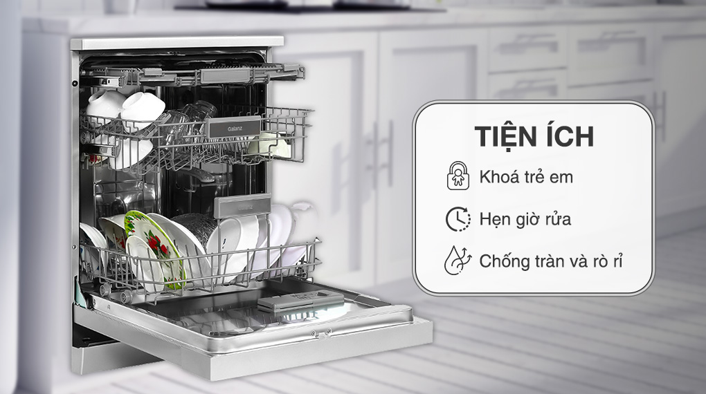 – Công suất hoạt động của máy rửa chén Galanz có thể đạt 1850W, rửa được khoảng 3 – 4 bữa ăn Việt (tương đương với 15 bộ chén dĩa châu Âu).