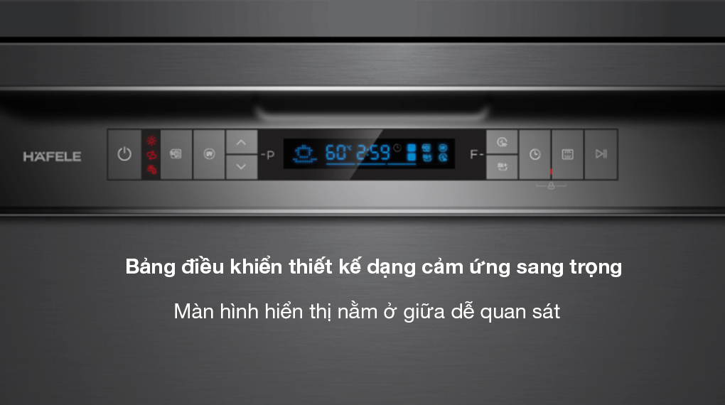 Bảng điều khiển được thiết kế dạng nút cảm ứng với ký hiệu đơn giản, giúp bạn dễ nhận biết và sử dụng các chức năng của máy rửa chén. Hơn nữa, màn hình hiển thị được bố trí ở giữa bảng điều khiển, hỗ trợ khả năng quan sát chức năng và thời gian rửa được thuận tiện mỗi khi bạn thao tác.