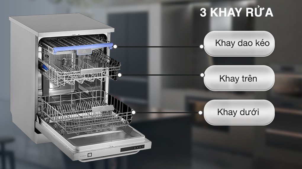 – Hệ thống 3 tay phun (trên, giữa, dưới) giúp bát đĩa luôn được rửa sạch từ mọi phía.