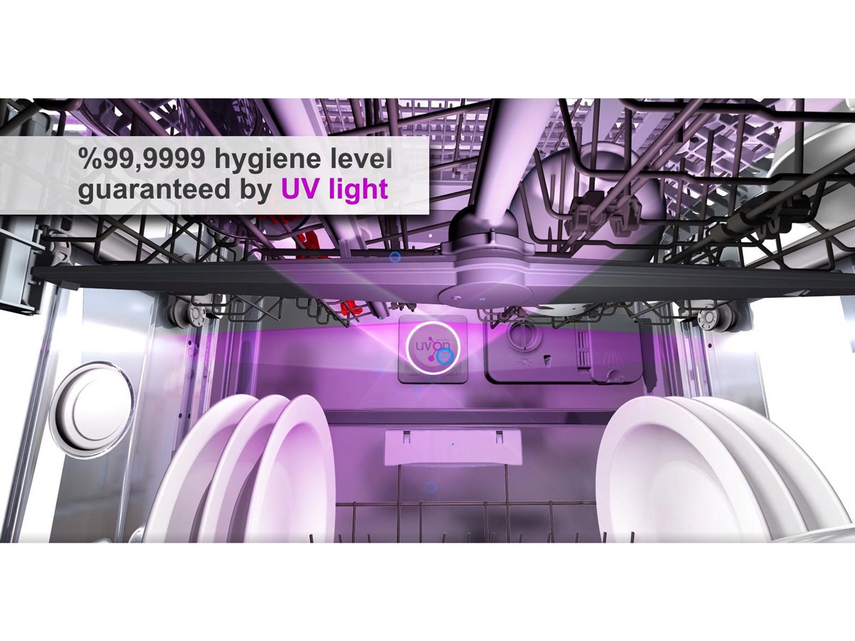 Đặc biệt, máy còn tích hợp công nghệ UVON và ion diệt khuẩn giúp loại bỏ 99.99% vi khuẩn còn sót lại trên bát đĩa sau khi rửa. Đây là tính năng vượt trội giúp bảo vệ sức khỏe của gia đình bạn, đặc biệt là đối với các gia đình có trẻ nhỏ.