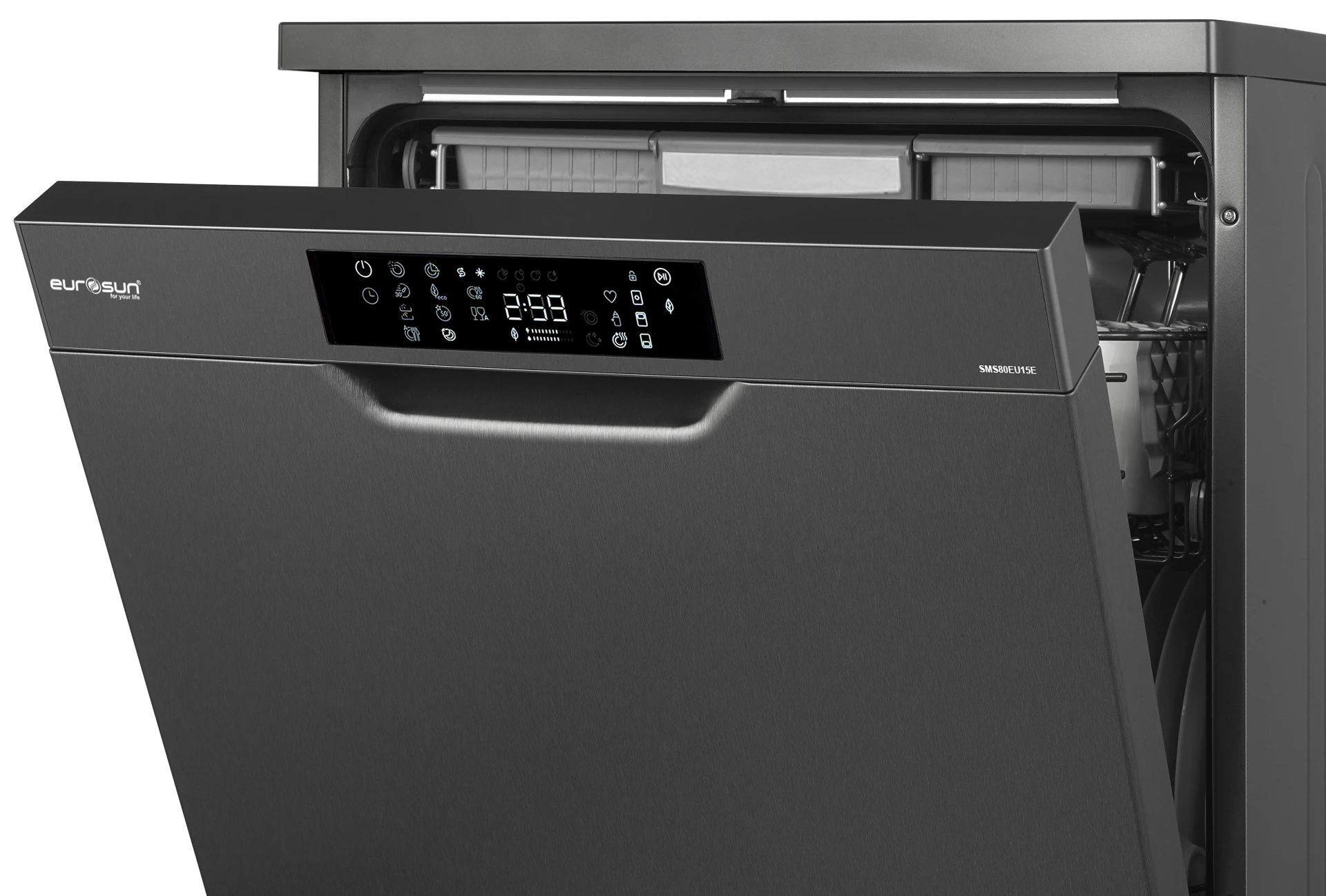 Máy rửa bát Eurosun SMS80EU15E có công suất tiêu thụ là 1900W, lượng nước tiêu thụ là 5.4-9 lít/1 lần rửa, cho phép rửa 14 bộ bát đĩa Châu Âu tương đương với 1,5-2 bữa ăn Việt (gia đình 4-6 thành viên). Máy trang bị 10 chương trình rửa được tùy chỉnh dễ dàng trên bảng điều khiển điện tử kết hợp màn hình LED.