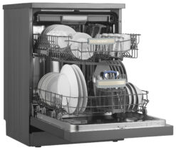 Giàn rửa dưới cùng của máy có khoang chứa rộng hơn, cho phép rửa các loại nồi nấu, chảo, bát đĩa to….Các loại đĩa thìa, người dùng có thể cho vào vào giỏ màu xám ở trong khay rửa dưới cùng hoặc xếp làm ngang, sao cho các không có bất cứ vật dụng nào cản trở vào tay quay gạt nước của máy.