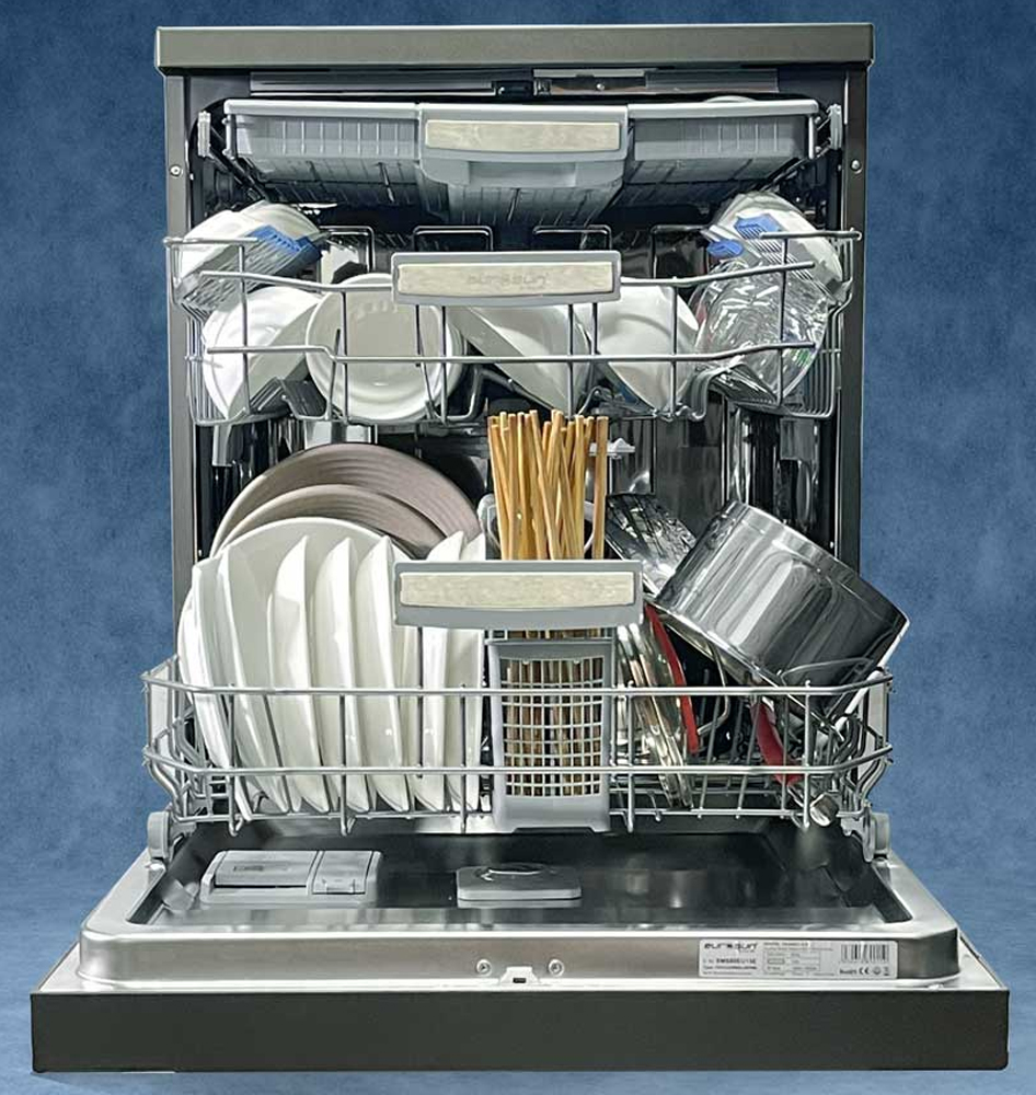 Máy rửa bát Eurosun SMS80EU15E trang bị 3 ngăn chứa cơ động + 1 giỏ để đũa, ly cốc. Hệ thống ray nâng hạ Vario Space thông minh dễ dàng thay đổi chiều cao giữa các khay.