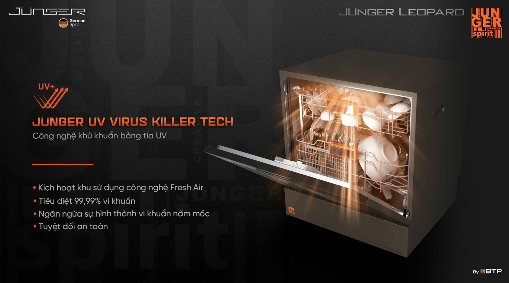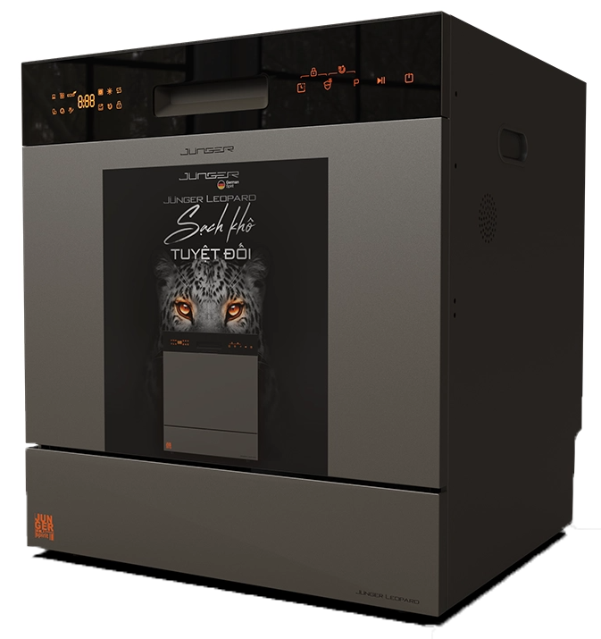 Junger UV Virus Killer Tech: Diệt 99,99% Vi Khuẩn, Bảo Vệ Sức Khỏe Gia Đình An toàn sức khỏe là ưu tiên hàng đầu. DWJ-133-MS được trang bị công nghệ diệt khuẩn bằng tia UV độc quyền, kết hợp với chu trình rửa bằng nước nóng lên đến 75°C. Sự kết hợp mạnh mẽ này giúp tiêu diệt gần như tuyệt đối vi khuẩn, virus và các tác nhân gây hại, mang đến sự an tâm tuyệt đối cho các gia đình có trẻ nhỏ và người lớn tuổi.