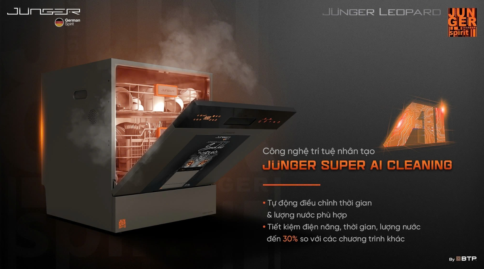 Junger Super AI Cleaning: Rửa Thông Minh Bằng Trí Tuệ Nhân Tạo Thay vì phải đắn đo lựa chọn chương trình rửa phù hợp, công nghệ AI Cleaning sẽ làm điều đó thay bạn. Chỉ với một chạm duy nhất, hệ thống cảm biến thông minh sẽ tự động phân tích độ bẩn của bát đĩa và lượng nước, từ đó đưa ra chu trình rửa tối ưu nhất. Điều này không chỉ đảm bảo hiệu quả sạch sâu mà còn giúp tiết kiệm điện, nước lên đến 30% so với các chương trình thông thường. Đây là chương trình được Junger khuyên dùng cho nhu cầu hàng ngày, đơn giản hóa trải nghiệm người dùng đến mức tối đa.