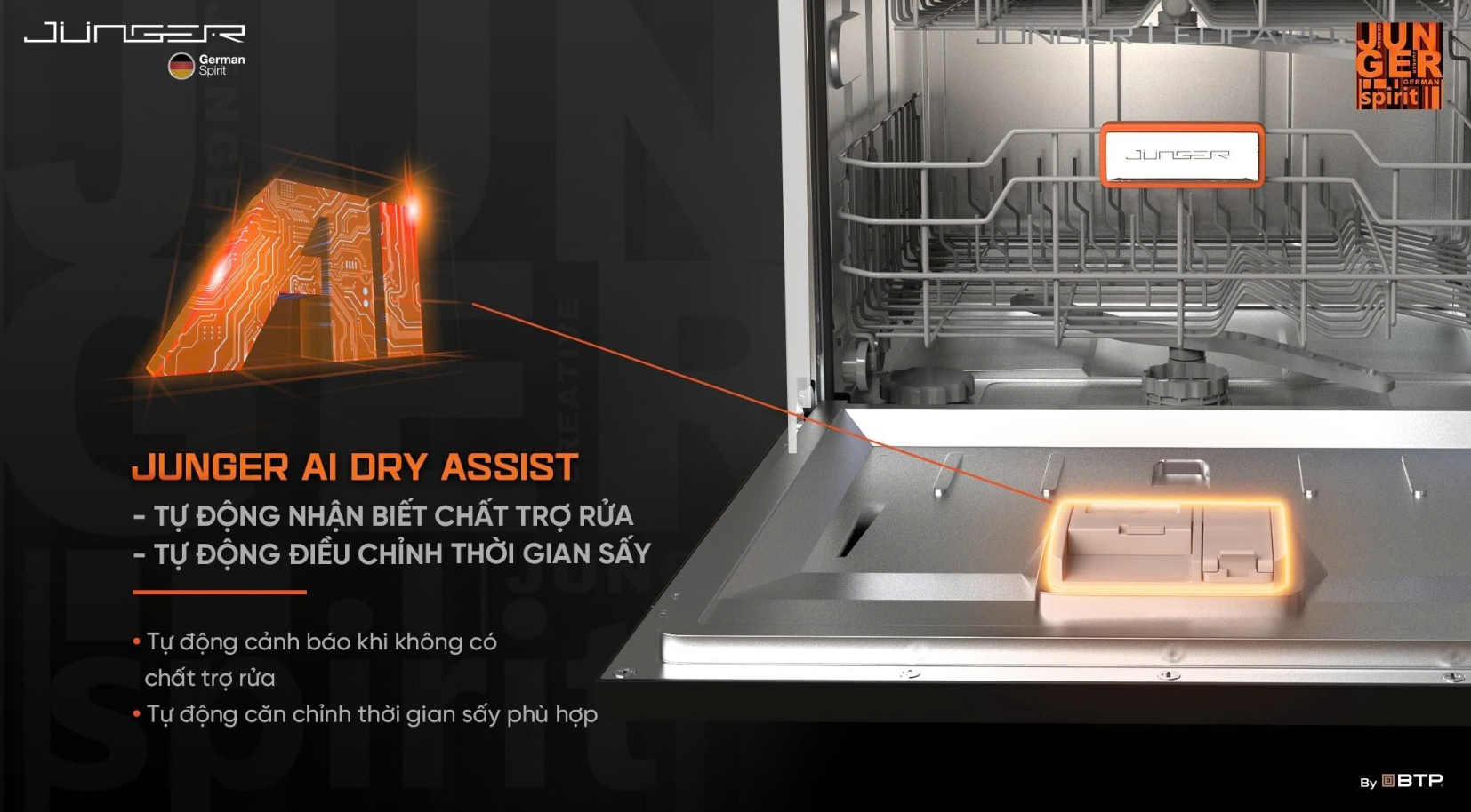 Junger Super Dry Tech & Fresh Air: Sạch Khô Hoàn Hảo, Khử Mùi Triệt Để Nỗi lo bát đĩa còn ẩm ướt, đọng nước sau khi rửa sẽ hoàn toàn biến mất. Công nghệ sấy nóng Junger Super Dry Tech kết hợp hệ thống thanh gia nhiệt mạnh mẽ và quạt đối lưu, giúp làm khô cong mọi vật dụng. Đặc biệt, công nghệ khử mùi bằng gió tươi đối lưu Fresh Air sẽ tự động trao đổi không khí trong khoang máy, giúp ngăn chặn mùi hôi và nấm mốc, biến máy rửa bát thành nơi lưu trữ chén đĩa vệ sinh và an toàn.