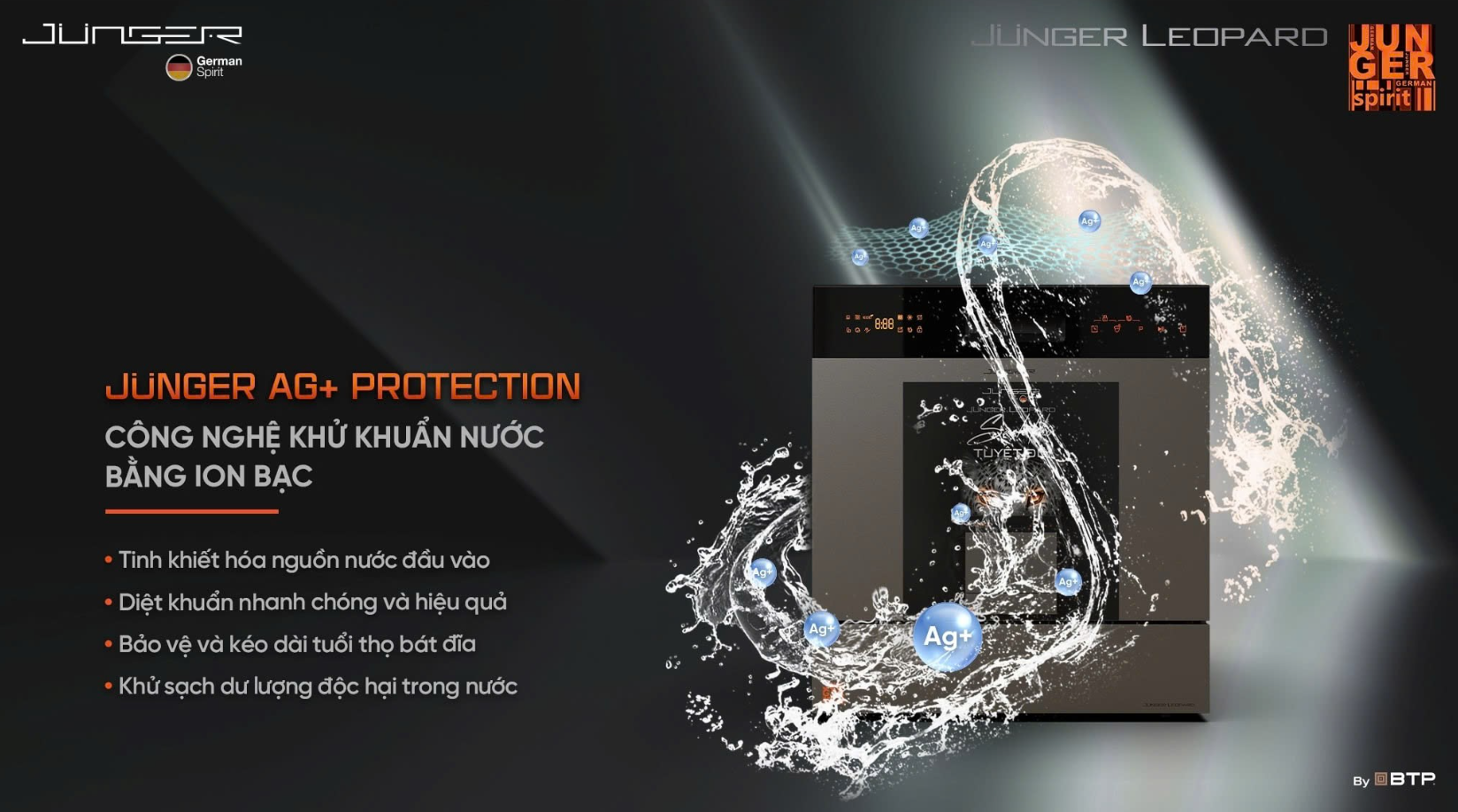 Junger Ag+ Protection: Tinh Khiết Nguồn Nước Đầu Vào Chất lượng nguồn nước cũng ảnh hưởng đến hiệu quả rửa. Công nghệ khử khuẩn nước bằng ion Bạc (Ag+) sẽ tinh khiết hóa nguồn nước trước khi đưa vào chu trình rửa, giúp loại bỏ vi sinh vật, hạn chế dư lượng độc hại và bảo vệ màu sắc, hoa văn trên bát đĩa không bị phai mờ theo thời gian.