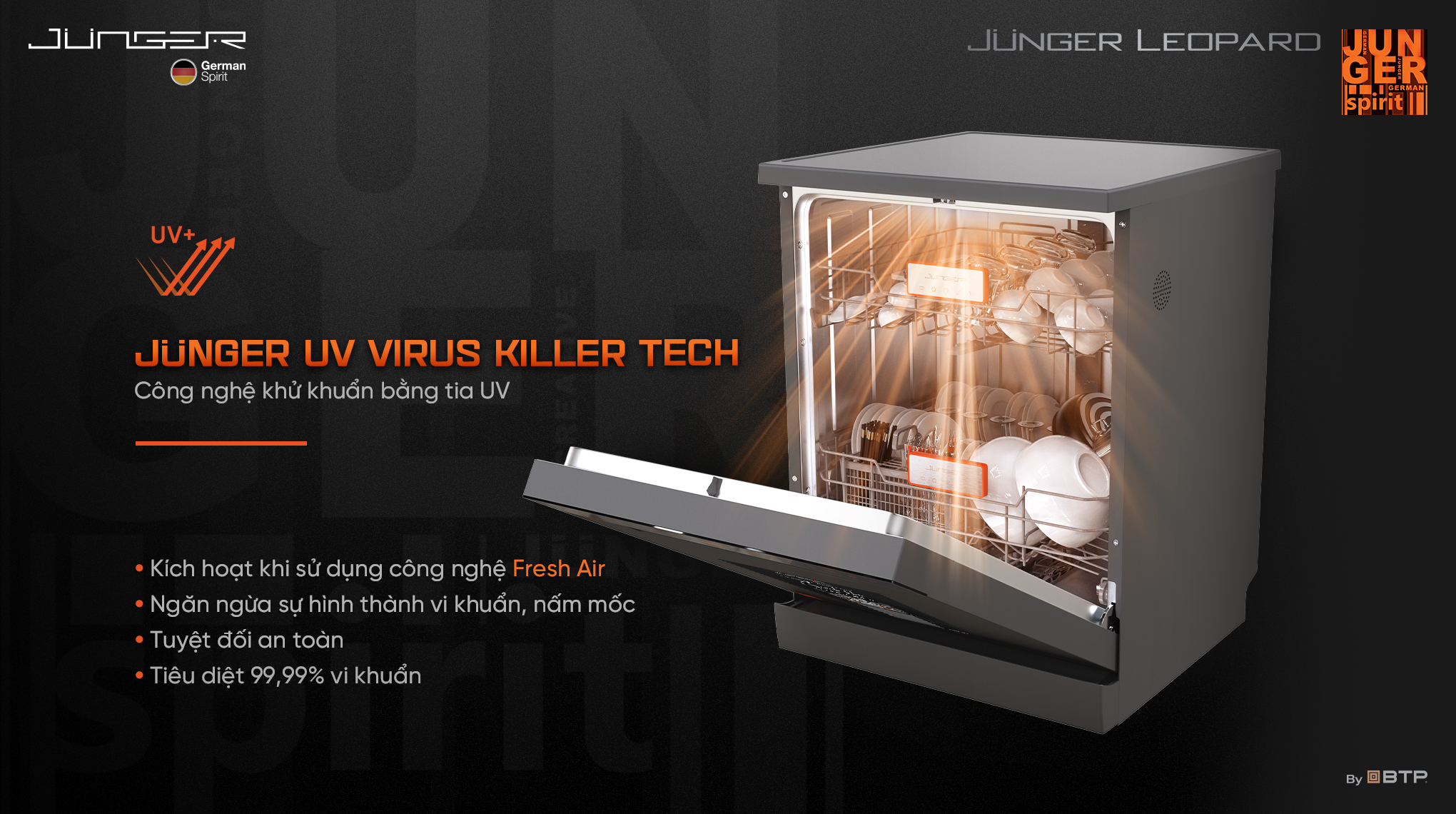 Công nghệ này rửa khử khuẩn bằng nước nóng 75℃, tiệt trùng bằng tia UV Virus Killer Tech kết hợp với sấy khô Junger Super Dry và khử mùi bằng gió tươi đối lưu Fresh Air cho khả năng tiêu diệt đến 99,99% vi khuẩn, ngăn chặn sự hình thành vi khuẩn, nấm mốc và ngăn ngừa mùi hôi bám trên bát đĩa, mang đến sự an toàn tuyệt đối cho người sử dụng. Chức năng khử trùng/diệt khuẩn bằng tia UV cũng sẽ tự động được kích hoạt khi chọn bất kỳ chế độ rửa nào khác.