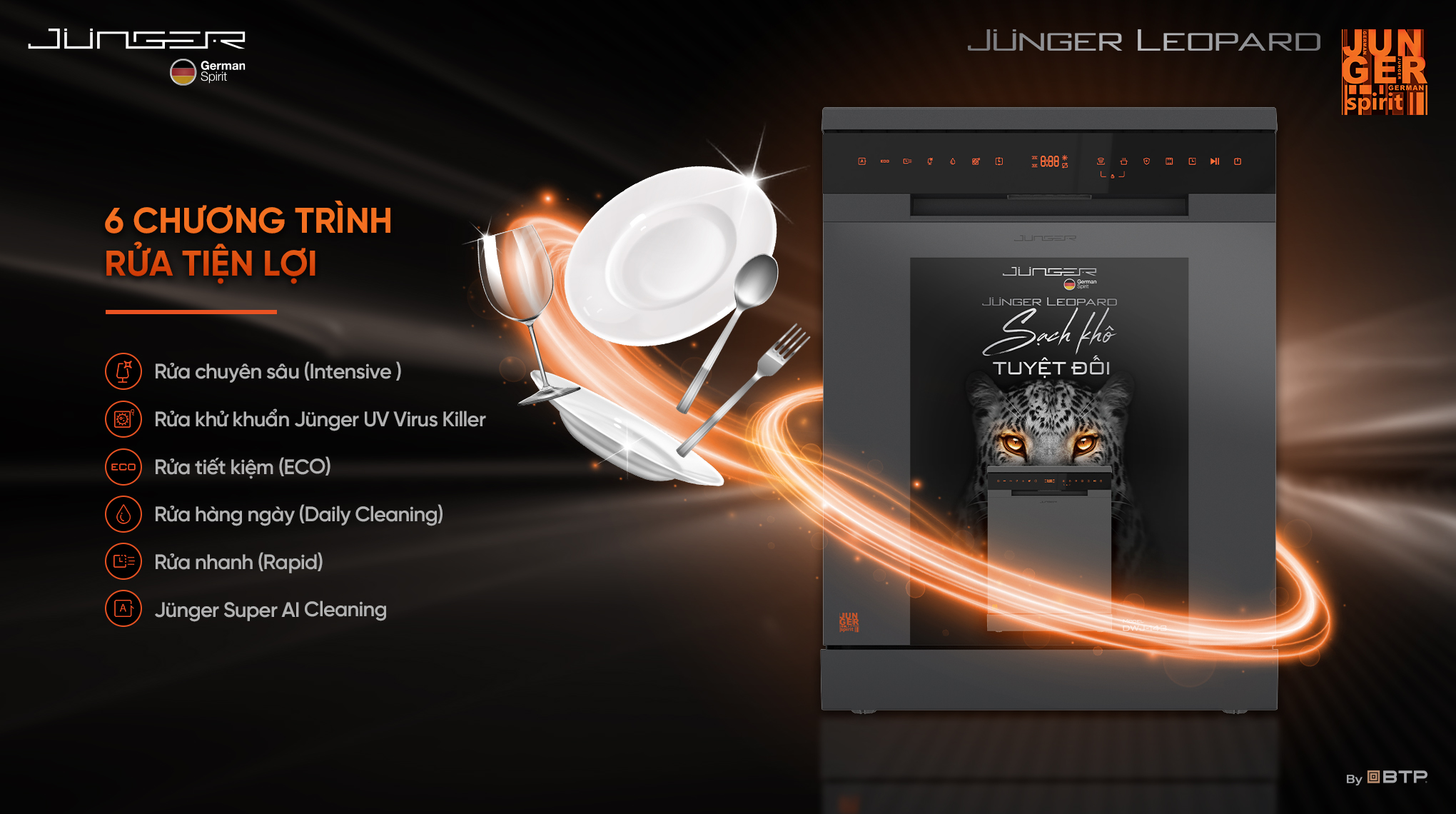Vượt trội so với các sản phẩm cùng loại trên thị trường, Junger Leopard DWJ-143 được ứng dụng 5 công nghệ hiện đại bao gồm: công nghệ sấy nóng Junger Super Dry Tech, công nghệ AI tự động Junger Super AI Cleaning, công nghệ khử trùng/diệt khuẩn bằng tia UV Junger UV Virus Killer Tech, công nghệ khử mùi bằng gió tươi đối lưu Fresh Air, và công nghệ rửa từng phần Half Load. Nhờ đó, dụng cụ nấu nướng rửa bằng DWJ-143 luôn “Sạch khô tuyệt đối“, đảm bảo an toàn cho sức khỏe người sử dụng.