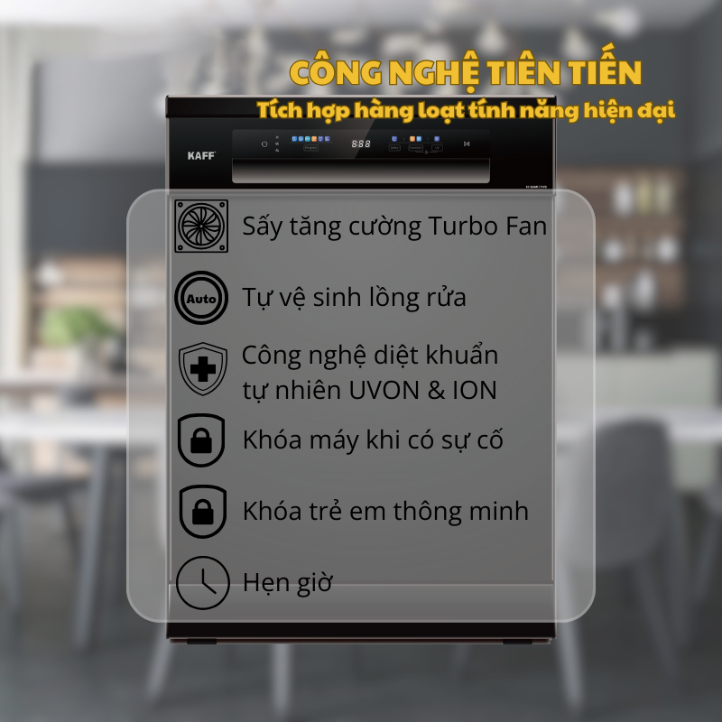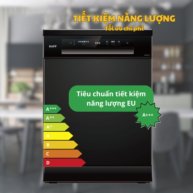 Máy rửa chén Kaff KF-BHMI775YB cũng được trang bị nhiều tính năng an toàn như chức năng khóa máy khi có sự cố, chống rò nước và điều khiển cảm ứng hiện đại trên màn hình Led. Với tiêu chuẩn tiết kiệm năng lượng châu Âu A+++, máy giúp tiết kiệm điện năng mà vẫn đảm bảo hiệu suất rửa tốt nhất.