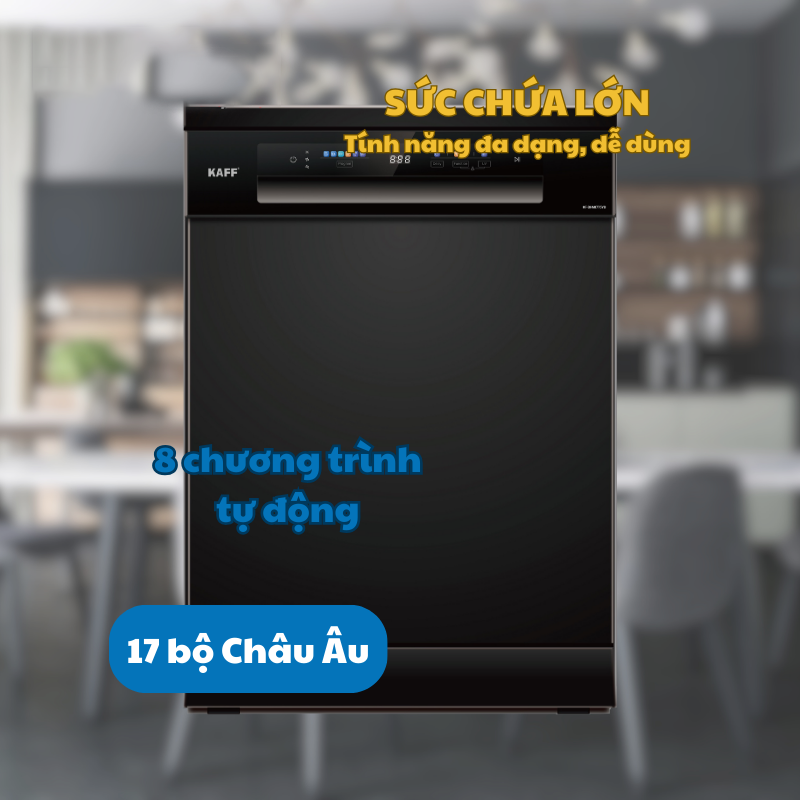 Máy rửa chén Kaff KF-BHMI775YB có thể rửa được 17 bộ đồ ăn Châu Âu với 8 chương trình rửa tích hợp, bao gồm các chương trình rửa khác nhau như Prewash, Mini 14′, Quick 30′ 40°C, Eco (Standard Programme), Super 50′ 65°C (Quick Clean), Easy Care 60°C, Dual Pro Wash 60°C, Smart 30°C – 50°C.