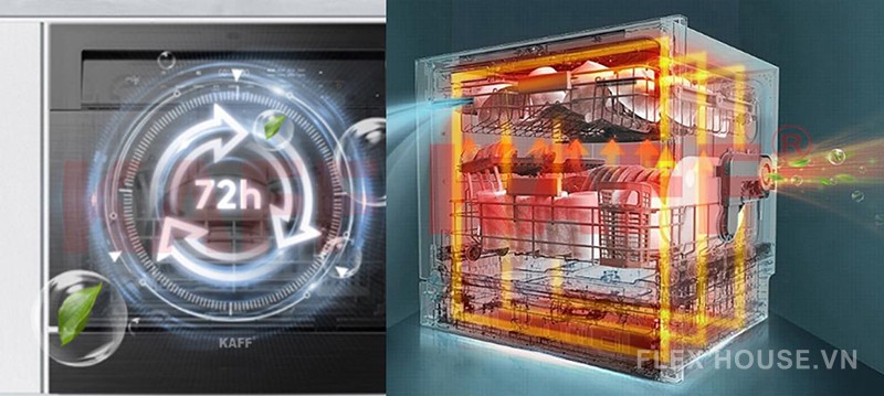 Không chỉ dừng lại ở khả năng rửa sạch, KAFF KF-BHMI775YS còn ứng dụng nhiều công nghệ tiên tiến giúp diệt khuẩn và sấy khô hiệu quả. Với nhiệt độ nước lên đến 72°C, máy có khả năng loại bỏ 99.99% vi khuẩn nhờ chức năng khử khuẩn (Sterilization). Hệ thống PTC sấy khô khí nóng giúp chén bát khô hoàn toàn, trong khi công nghệ sấy khí tươi 72H liên tục dẫn lưu không khí vào khoang máy, giữ cho bát đĩa luôn sạch sẽ và không có mùi hôi. Máy còn tích hợp tia UV khử trùng (Internal UV Light) để tiêu diệt vi khuẩn, cùng với chức năng tạo Ozon giúp loại bỏ mùi khó chịu.