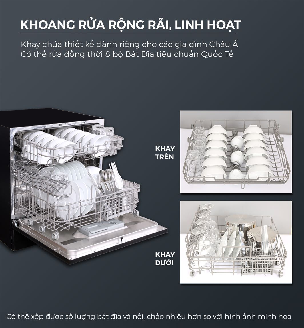Tiết kiệm công sức: Không cần phải tốn sức cho việc rửa bát bằng tay, giờ đây bạn chỉ cần chỉ cần bỏ bát đĩa lên khay, chọn chương trình rửa là xong. Thời gian rửa bát bạn có thể tận dụng để nghỉ ngơi hay chăm sóc gia đình, làm những công việc khác nhẹ nhàng và thanh thản hơn.
