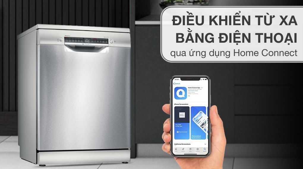 – Điều khiển bằng điện thoại thông qua ứng dụng Home Connect: bằng cách kết nối thiết bị gia dụng này với điện thoại hoặc máy tính bảng với Home Connect, việc điều khiển thiết bị trở nên nhẹ nhàng, đơn giản, bạn có thể khởi động chương trình rửa ngay cả khi đang ở phòng khác, trên đường về nhà hoặc đang ở công ty.