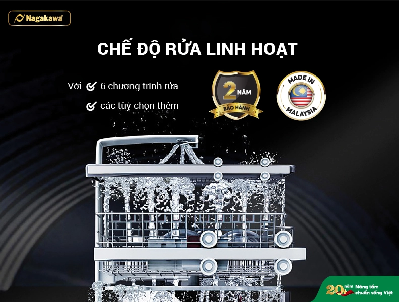 Nagakawa NAG3601M15 được tích hợp sẵn 6 chương trình rửa tiện tích và 4 tùy chọn thông minh thay bạn chăm sóc bát đĩa đúng cách trong khi vẫn đảm bảo hiệu quả rửa cực sạch. Trong đó, chương trình rửa sử dụng các tia nước áp lực ở nhiệt độ cao, giúp tạo ra hơi nước, loại bỏ những cặn bẩn cứng đầu trên bát đĩa một cách nhẹ nhàng nhất. Công nghệ sấy tăng cường Dry+ giúp tăng cường hiệu quả diệt khuẩn và sấy khô nhanh chóng bát đĩa của cả gia đình.