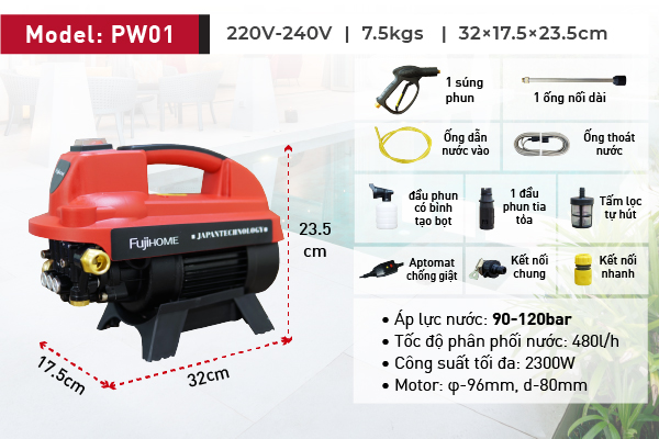 Máy rửa xe mô tơ cảm ứng từ FujiHOME PW01 là thiết bị phun xịt rửa vệ sinh trong gia đình, giúp tiết kiệm thời gian. Máy dùng vào nhiều mục đích như rửa xe máy, xe đạp, ô tô, vệ sinh nhà cửa sân vườn chuồng trại cũng như vệ sinh các thiết bị gia dụng như điều hoà (máy lạnh)….