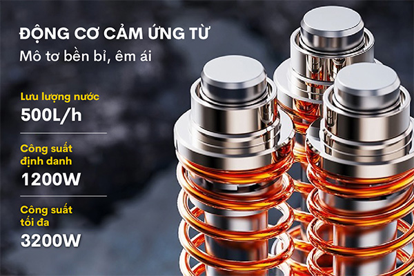 Máy sử dụng động cơ cảm ứng từ giúp vận hành bền bỉ và êm ái với công suất tối đa 3200W và lưu lượng nước 600 lít/giờ.
