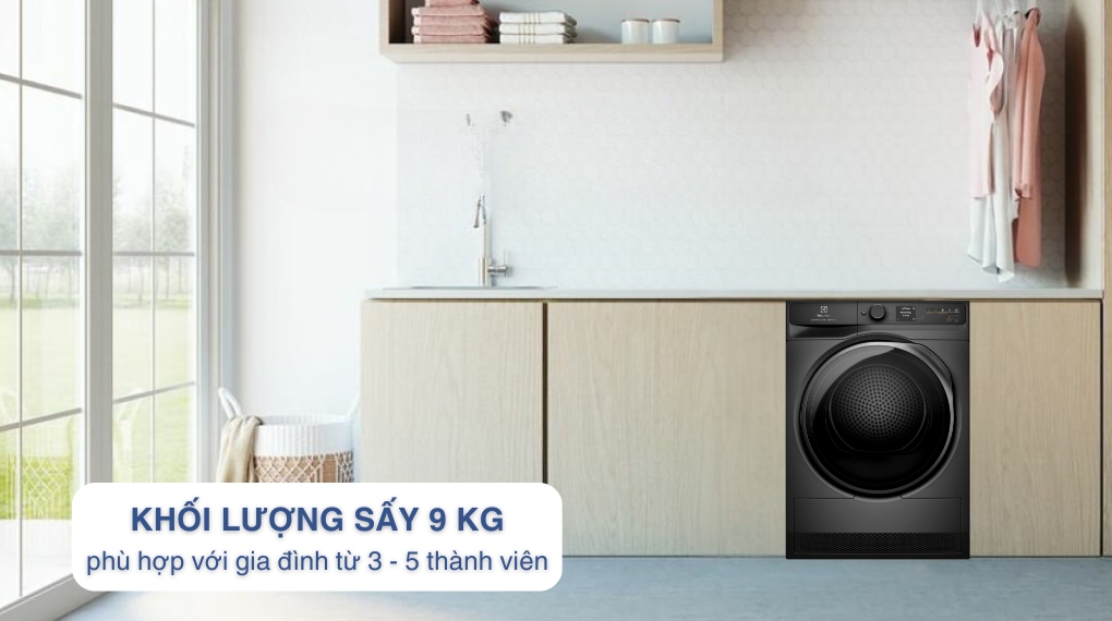 – Máy có khối lượng sấy tối đa là 9 kg thích hợp cho các gia đình từ 3 – 5 thành viên, hoặc gia đình có ít thành viên nhưng nhu cầu giặt giũ, làm khô quần áo cao.