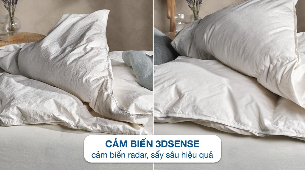 – Công nghệ 3DSense sử dụng cảm biến thông minh để đo độ ẩm hiện có trong quần áo. Máy tự động điều chỉnh thời gian và nhiệt độ sấy phù hợp, đảm bảo quần áo được sấy khô tối ưu mà không gặp phải tình trạng sấy quá lâu gây hao tốn điện năng, hoặc nhiệt độ quá cao làm co rút vải. Công nghệ cảm biến 3DSense giúp bảo vệ sợi vải, đồng thời mang lại hiệu quả tiết kiệm năng lượng trong quá trình vận hành.