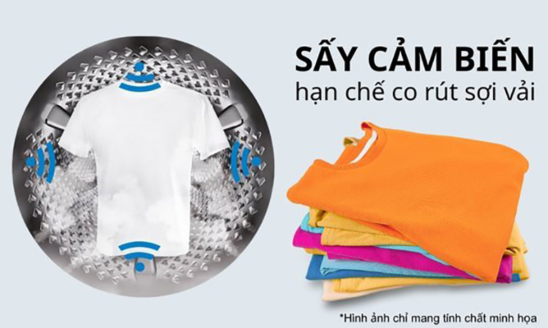 Công nghệ cảm biến đo độ ẩm thông minh, giúp bảo vệ quần áo khỏi tình trạng sấy quá khô hoặc quá nóng. Trong suốt quá trình sấy, máy sẽ liên tục đo lường độ ẩm của quần áo và tự động dừng lại khi quần áo đã được sấy khô hoàn toàn. Điều này giúp hạn chế tình trạng sấy khô quá mức, tránh hiện tượng co rút và hư hỏng vải, đồng thời giúp cho quần áo luôn bền màu và như mới.