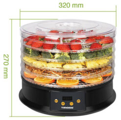 Máy sấy hoa quả có dung lượng lớn, gồm 5 tầng, đáp ứng nhu cầu sấy lớn. Giá để các khay sấy thực phẩm dùng vật liệu dày dặn, thân thiện với môi trường và chịu được nhiệt độ cao. Giá tiếp xúc trực tiếp đến thực phẩm, tránh sự xâm hại của các sinh vật từ môi trường bên ngoài.