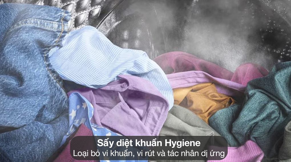 – Máy tích hợp nhiều chương trình sấy linh hoạt như sấy nhanh 40 phút, sấy hỗn hợp, sấy vải tổng hợp, sấy chăn ga,… Đặc biệt, chế độ sấy diệt khuẩn Hygiene giúp loại bỏ vi khuẩn và các tác nhân gây dị ứng, rất thích hợp cho quần áo trẻ em và người có làn da nhạy cảm.