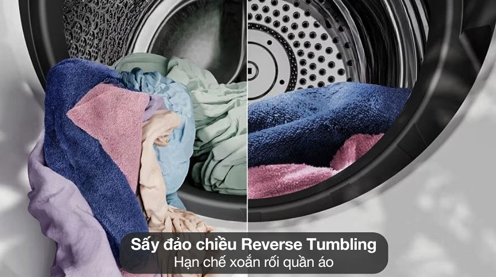 – Công nghệ sấy đảo chiều Reverse Tumbling vận hành với cơ chế quay đảo chiều, giúp quần áo không bị xoắn rối và giảm nhăn đáng kể. Nhờ vào chuyển động luân phiên của lồng sấy, quần áo được tách rời nhau, hạn chế ma sát và giữ cho sợi vải bền đẹp hơn.