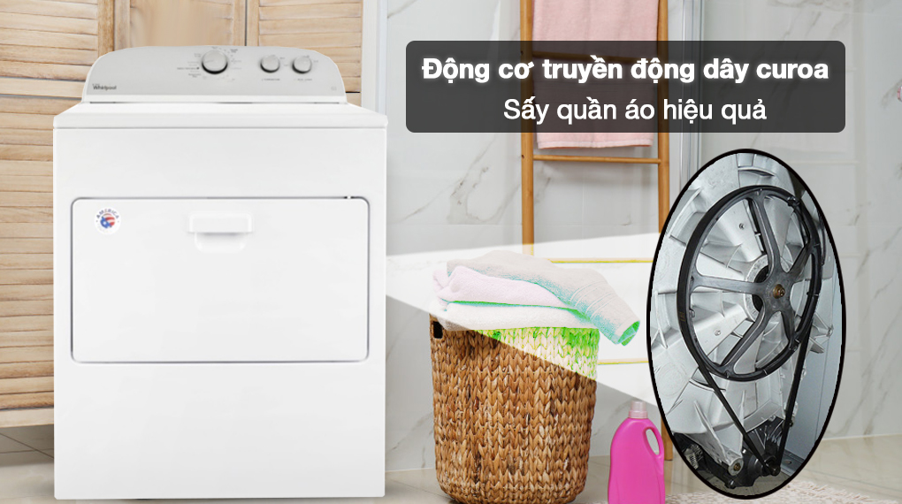 Máy sấy Whirlpool 15 kg này sử dụng động cơ truyền động gián tiếp bằng dây curoa.