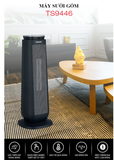 Với công suất tối đa đạt 2000W, máy sưởi TS9446 thích hợp cho các không gian có diện tích vừa và nhỏ.