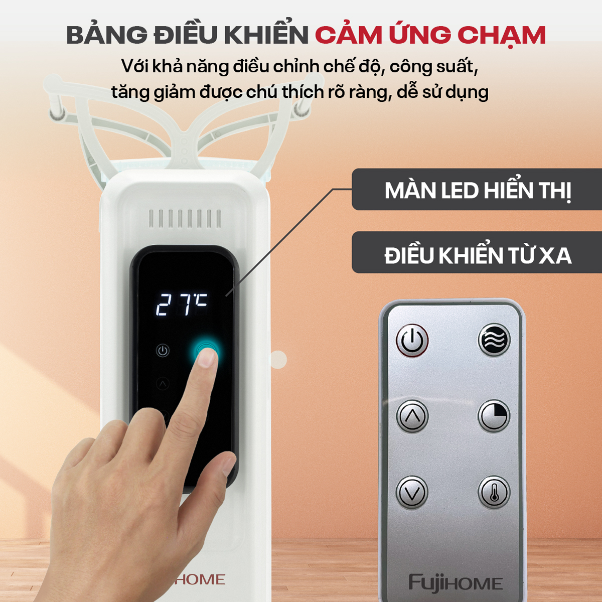Máy sưởi dầu cao cấp Fujihome OH8615 được trang bị màn hình LED hiển thị thông tin nhiệt độ và thời gian. Ngoài bảng điều khiển cảm ứng, sản phẩm còn trang bị điều khiển từ xa giúp bạn dễ dàng bật tắt hoặc điều chỉnh nhiệt độ mà không cần phải đến gần sản phẩm.Đi kèm với sản phẩm còn có giá treo đồ 2 thanh tiện lợi, bạn có thể sử dụng để sấy quần áo, khăn tay,… trong khi sưởi ấm rất tiện lợi và tiết kiệm điện đáng kể cho gia đình.
