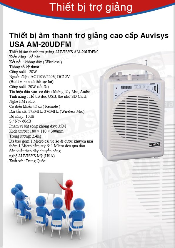 Máy trợ giảng Auvisys AM-20UDFM được trang bị nhiều micro, nhiều tính năng phụ, kiểu dáng trang nhã, âm thanh rõ nét… hiện đang là một trong những sản phẩm được rất nhiều giáo viên và các hướng dẫn viên tin dùng.